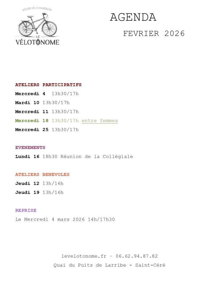 Février : Mercredi 4 13h30/17h - Mardi 10 13h30/17h - Mercredi 11 13h30/17h - Mercredi 18 13h30/17h entre femmes - Mercredi 25 13h30/17h