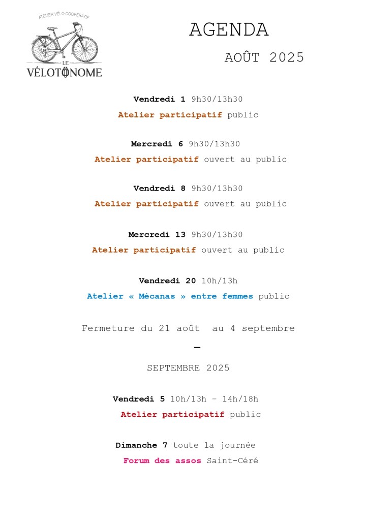 A noter ce mois de juillet, un atelier « Mécanas »: on bricole entre femmes, des ateliers bénévoles, notre participation au Festival d’art de Rue de Saint-Céré & une Guinguette Bricolo !