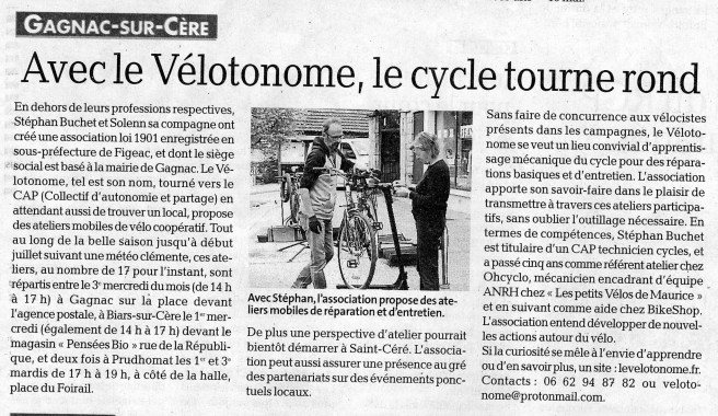 Le Vélotonome est l’atelier vélo solidaire et participatif situé à Saint-céré. Il vous permet de mieux comprendre le fonctionnement de votre fidèle bicyclette.